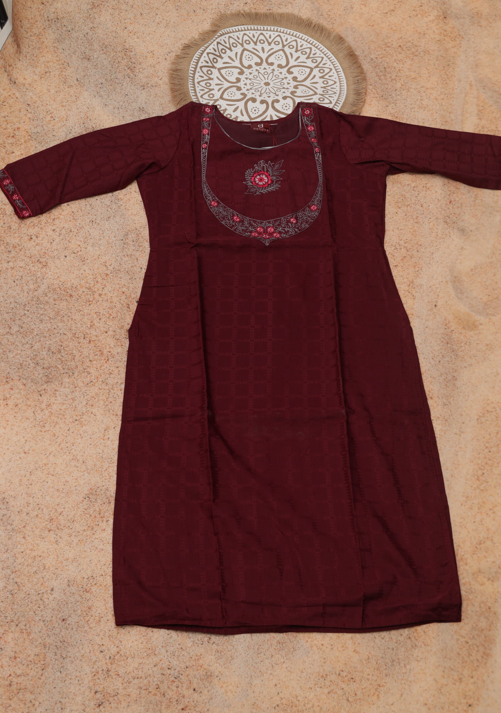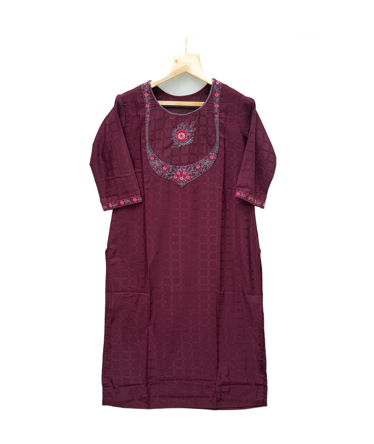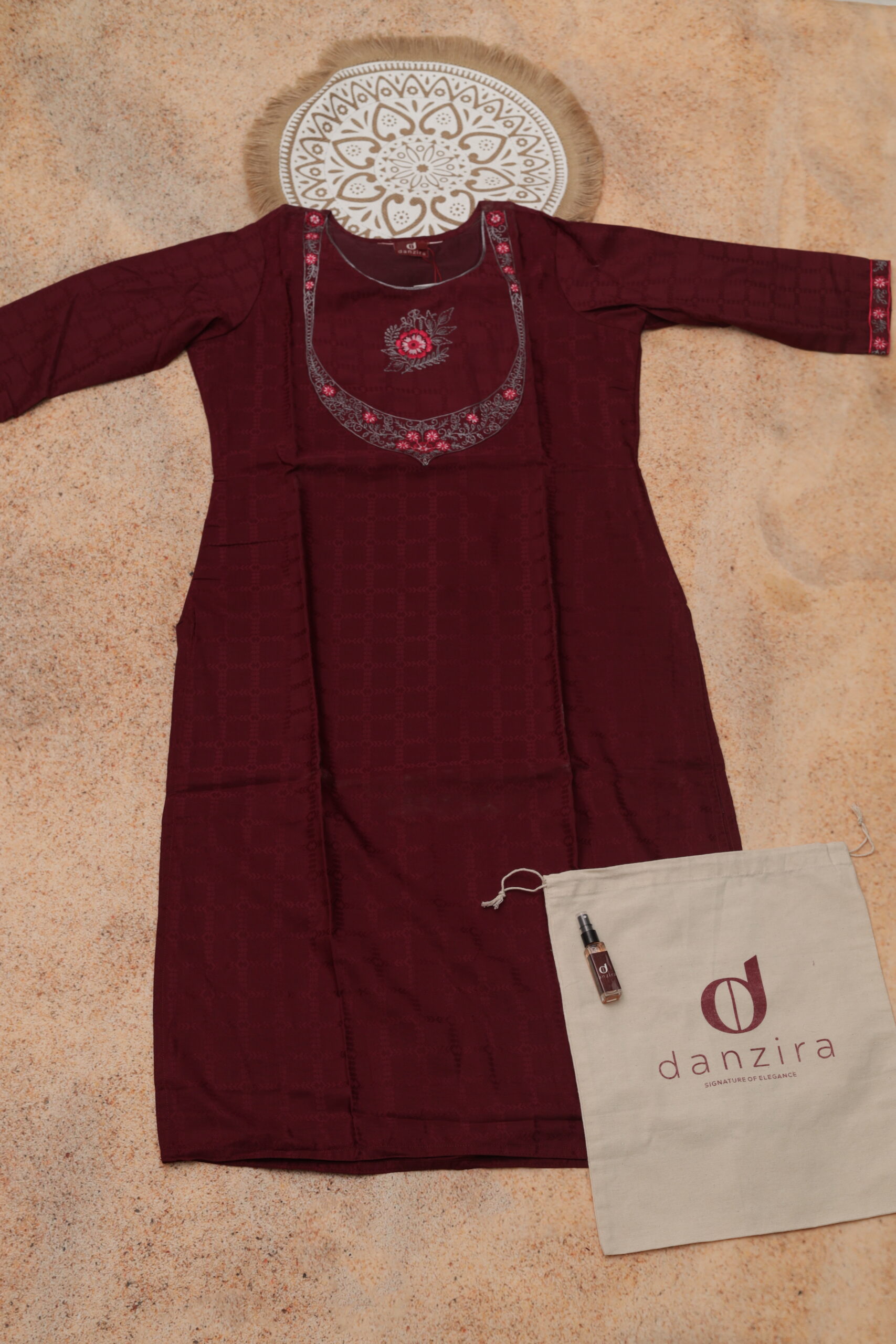 Meet the Maroon Cotton Embroidered Kurti from Danzira. A versatile kurti crafted for all day comfort and polished everyday style. Tailored silhouette with attention to fit and finishing. Sizes available: M, L, XL, 2XL, 3XL. Style it with leggings, jeans, or palazzos.