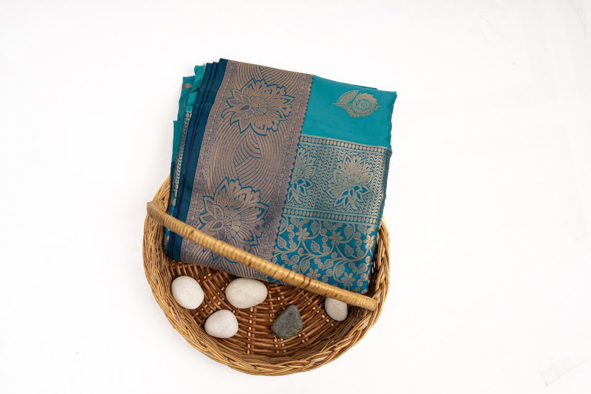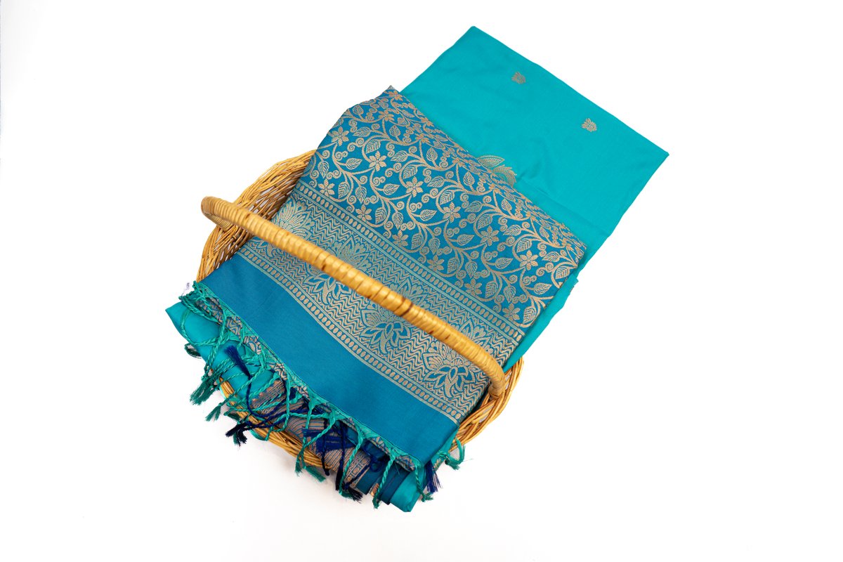 Discover the charm of the Turquoise Banarasi Silk Saree from Danzira. This saree is designed for comfort and style with a smooth drape and refined detailing. Perfect for celebrations, weddings, and special evenings. Pair with classic jewelry and heels for a complete look.