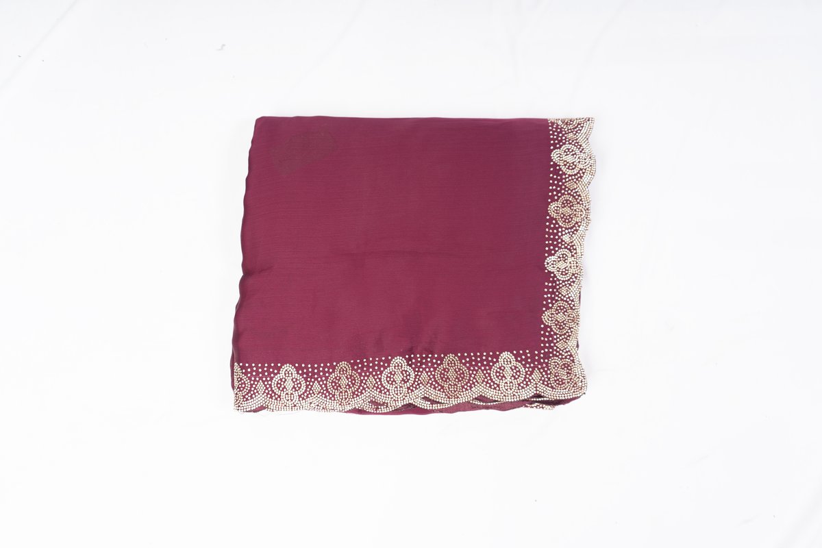 Discover the charm of the Wine Golden Dot Scallop Saree from Danzira. This saree is designed for comfort and style with a smooth drape and refined detailing. Perfect for celebrations, weddings, and special evenings. Pair with classic jewelry and heels for a complete look.